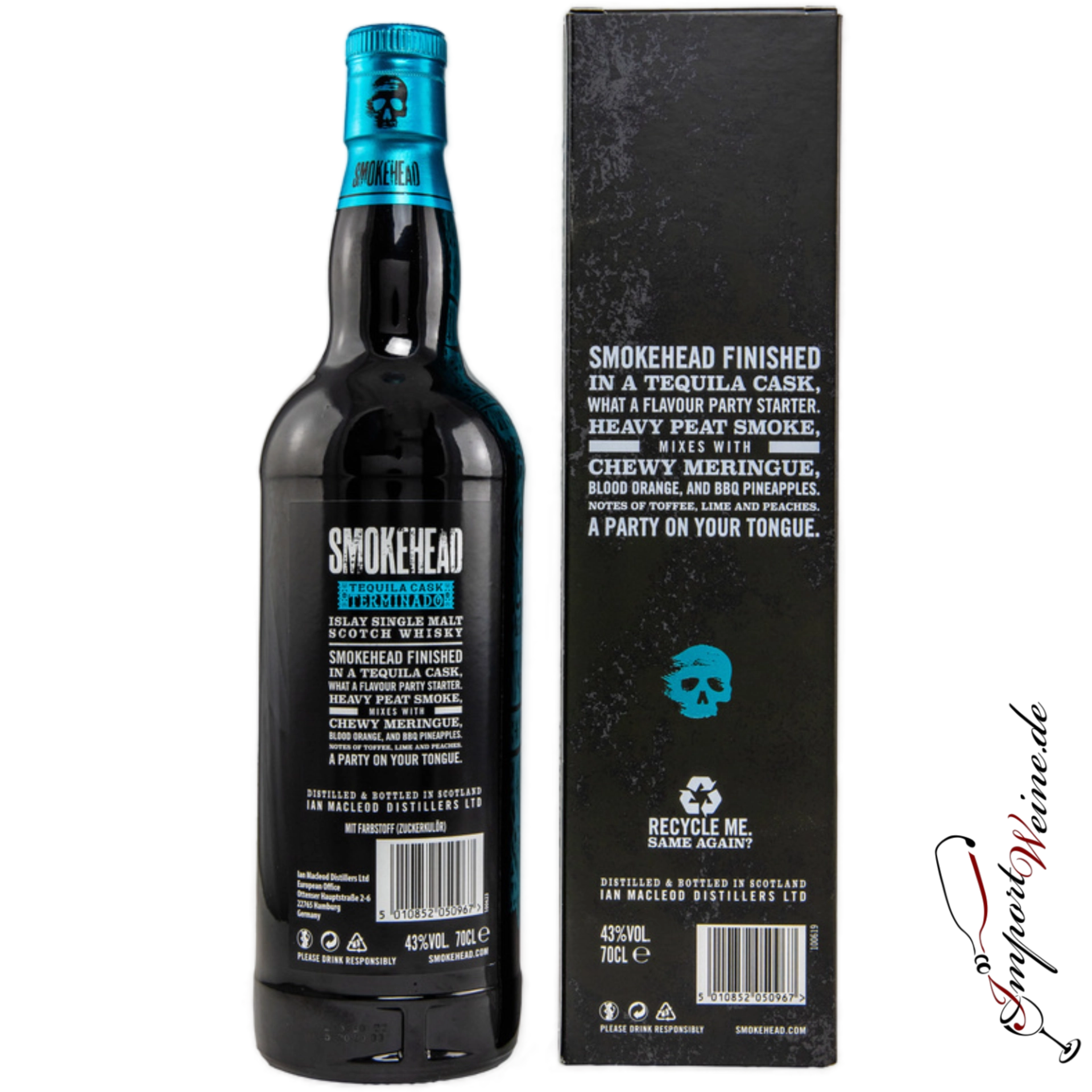 Smokehead ist eine Whisky‑Marke des unabhängigen Abfüllers Ian Macleod Distillers, der für seine kräftigen, stark getorften Islay‑Single‑Malts bekannt ist. Die Herkunfts‑Destillerie bleibt traditionell geheim, was Teil des Marken‑Mythos ist. Die Flaschen stechen durch ihr markantes Design mit Totenkopf‑Label hervor und richten sich an eine junge, experimentierfreudige Whisky‑Zielgruppe.